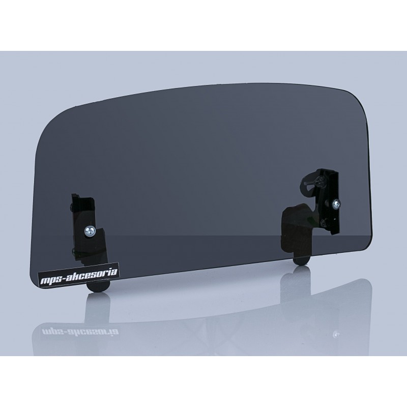Deflektor wykonany jest z poliwęglanu litego grubości 3mm i metalowych uchwytów z regulacją kąta położenia w kolorze czarny mat, malowanych proszkowo. Montowany jest do oryginalnej szyby za pomocą specjalnej taśmy oraz docisku z gumową podkładką przez co szyba pozostaje w stanie nienaruszonym i w dowolnym momencie można dokonać demontażu! Wszystkie śrubki użyte w deflektorze są nierdzewne, a nakrętki samohamowne co daje pewność, że nie poluzuje się on podczas użytkowania.